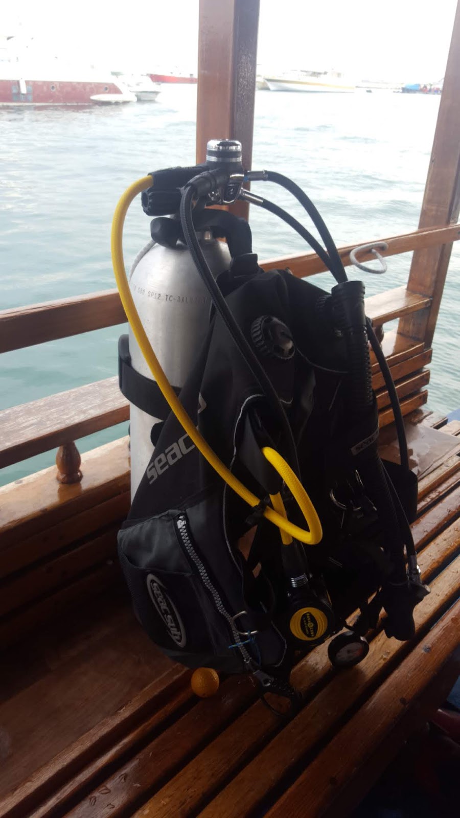 Ça commence demain matin, du coup on a déjà préparé tout le matériel dans le bateau de plongée pour ne rien avoir à faire demain et se mettre à l’eau directement. Bouteilles légères en alu. Mon matos est monté !