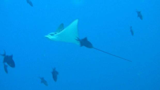 Aux Maldives l’eau n’est pas toujours limpide. Encore une fois on se met à l’eau dans le bleu, c’est vraiment génial, mais la visibilité n’est pas très bonne : dix m environ. Il y a de nombreuses particules dans l’eau. On se cale un petit quart d’heure sur le récif et quelques requins passent. Un petit requin pointe blanche passe en dessous de Elad et moi. Il s’approche, il tourne, vire. Et nous frôle à quelques dizaines de centimètres. Trop top !! Une belle petite raie aigle à points blancs tourne au dessus de nous.