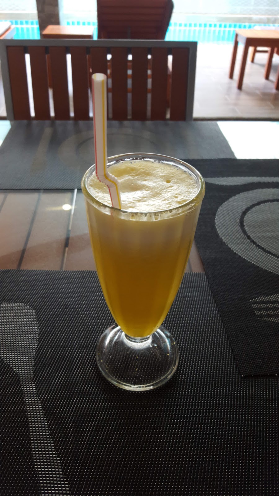 Je me suis trouvé un restaurant un peu select, avec la piscine devant la table du déjeuné. Un jus de fruit d’ananas frais pour commencer.