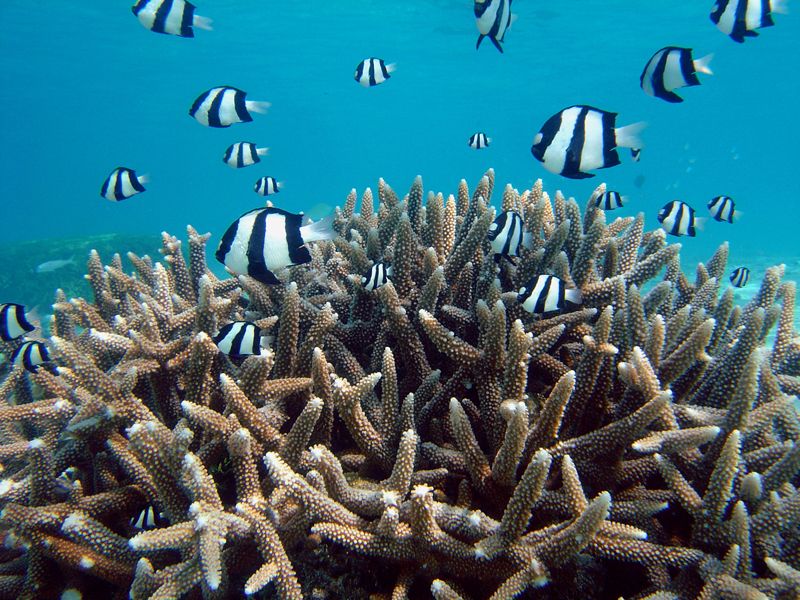 Beaucoup de petits poissons et de coraux, malheureusement tous bruns, morts.