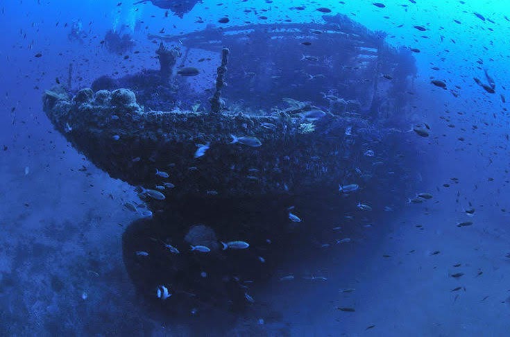 On ne change pas une équipe qui gagne : Thierry et moi prenons le premier tour et on coule comme des cailloux pour arriver au fond le plus vite possible et profiter tous seuls de l’épave. La visibilité est bonne et elle apparaît dès les 30m de profondeur.