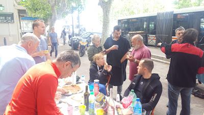 On rentre au port, on sort les tables pour l’apéro et qui arrive ? Henri Cosquer, LE découvreur de la grotte qui porte son nom (tee shirt rose et barbe blanche.