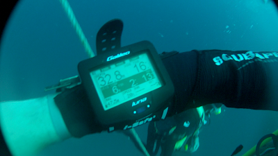 Voilà quinze minutes que nous sommes au fond et mon ordinateur indique déjà onze minutes de palier à venir, il est temps de partir.