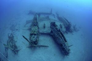 Le P38 commence à apparaître dès 20m. A 38m on s’équilibre, j’allume mon phare et la visite commence.