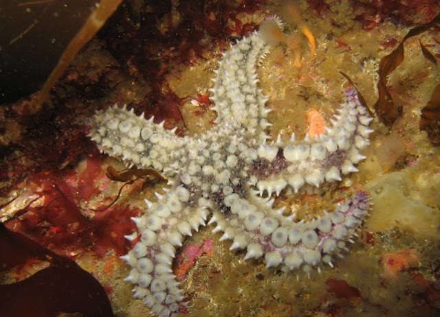 On déniche une belle murène lors de la remontée, un bras de poulpe qui dépasse d’un trou, une belle étoile glacière, de la taille d’une grosse main.