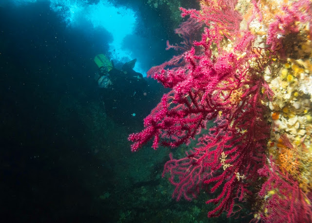 J’évolue le long du tombant, pendant toute la remontée et j’en prends plein les yeux, il y a des gorgones du fond jusqu’au haut du sec vers les 17m.