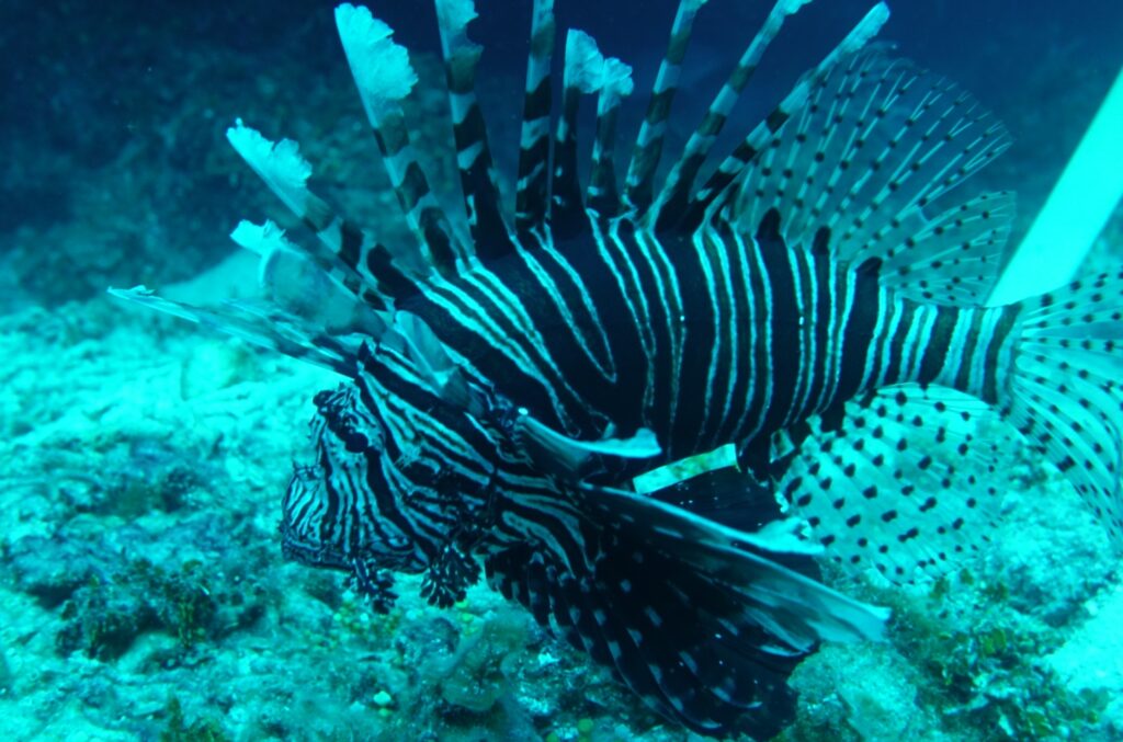 Je descends gentiment jusqu’à 24m mais rien de plus à voir, pas là peine de sonder plus bas. On promène gentiment, je frôle les gorgones. L’une d’elles, blanche avec des nervures bleues est splendide. Je la touche doucement en passant. Un poisson lion en pleine eau se laisse photographier.
