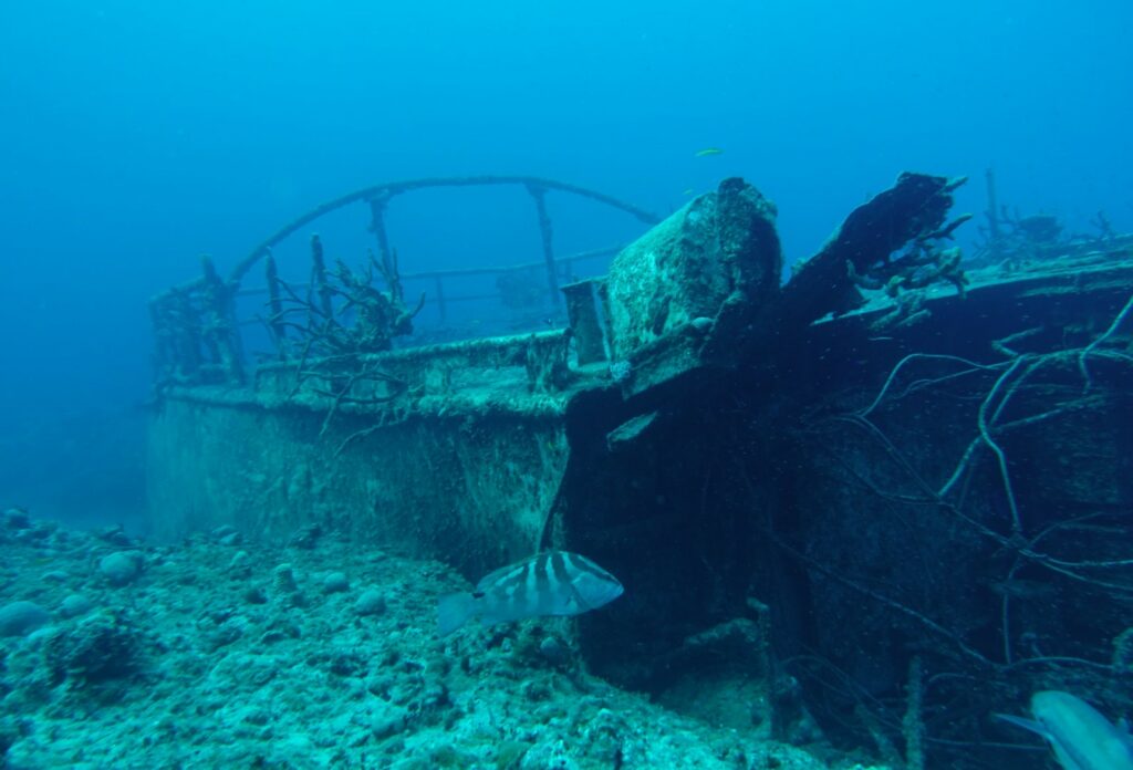 Au retour, on termine par l’épave. Le bloc arrière est bien conservé, c’est un gros cube de 6 ou 7m de côté, avec des cales. Tout l’avant est éparpillé en mille morceaux.