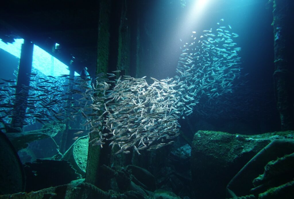 Je mets la tête dans les trous de cales, au milieu d’anchois bleu pâle. Mais rien de passionnant hormis ces mérous.