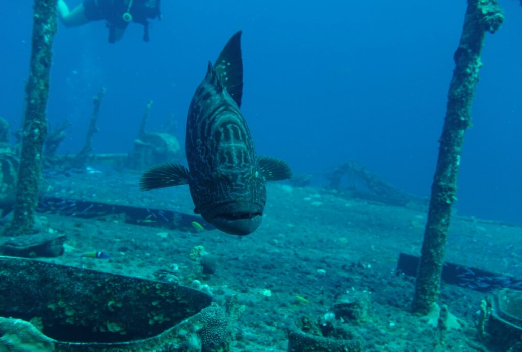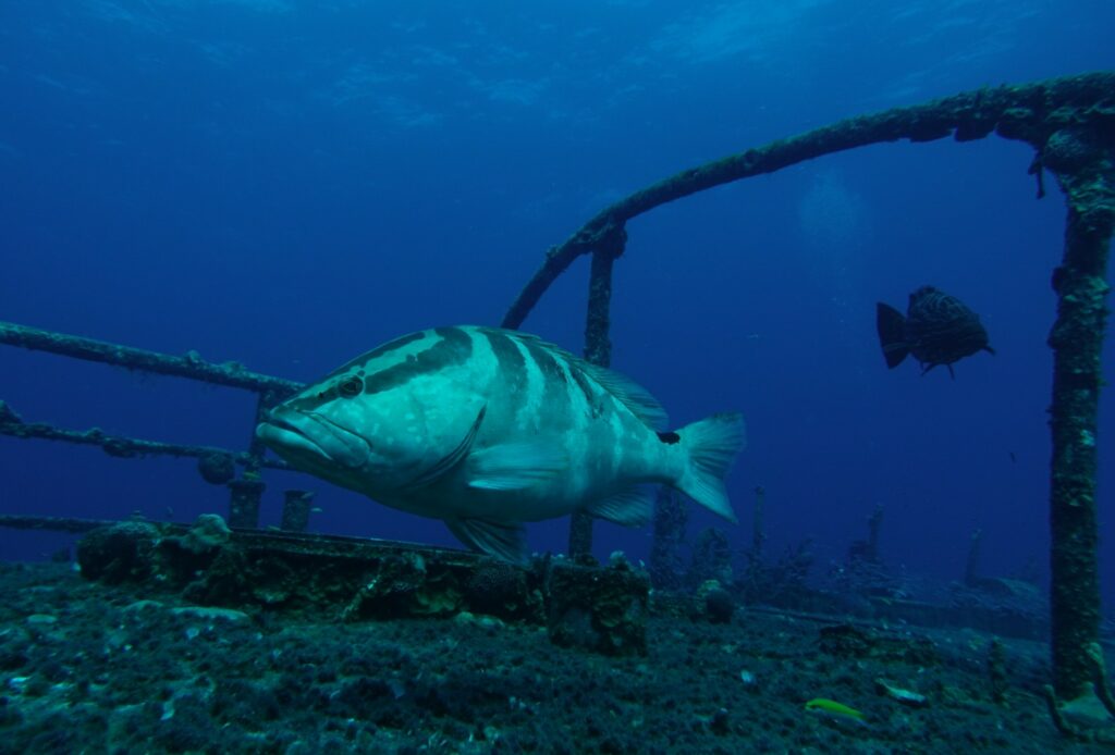 Il y traîne 2 gros mérous. Un brun tacheté très foncé et un presque blanc.