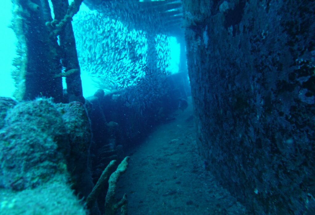 C’est à peine si on voit à travers tellement elles sont nombreuses. Il y en a aussi dans les coursives. Quelques gros sont là aussi. Comme l’épave est peu profonde on a une belle lumière.