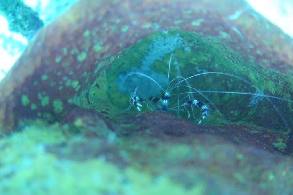 Je rentre dans la cage. Je déniche une crevette, rayée bleu et blanc, dans une éponge en forme de vase. Les concrétions sont vraiment très belles.