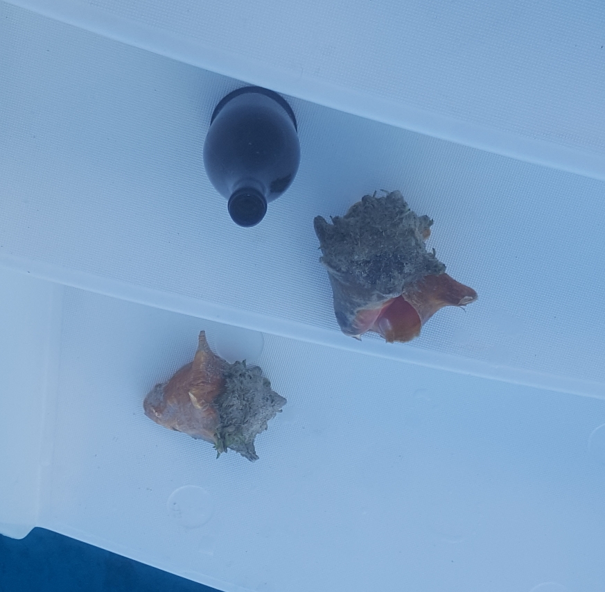 Je ramène un petit trésor. Une bouteille vide, qui ira à la poubelle, et 2 conques. Malheureusement personne ne sait comment les ouvrir ni les cuisiner.