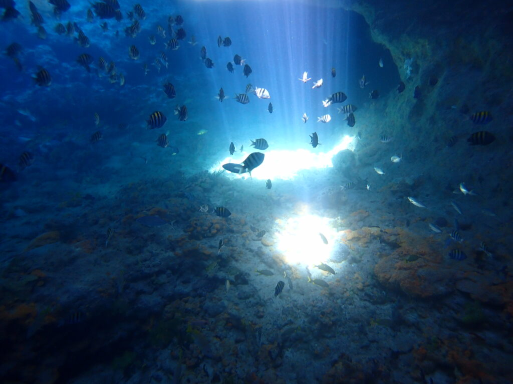 Il y a une belle lumière aux extrémités et il y a plusieurs cavités. Seule la première est pleine de poissons. Les plus proches viennent à moins de 20cm. Toujours pour la même raison …