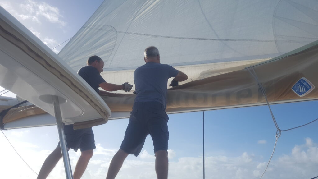 On lève la grand voile et les attaches du berceau cassent. On file au mat pour saucissonner le bas de la voile de notre mieux !