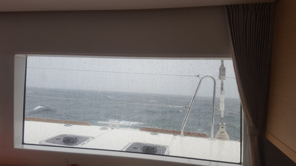 On déroule le foc et boum : 8 noeuds. On sera à Nassau rapidement mais secoués pendant 4h par 30 noeuds de vent de côté et des paquets de mer. L’eau est sombre et l’horizon complètement bouché.