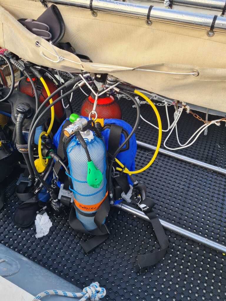 On arrive sur site, un peu à l’abri car il y a 50 cm de houle. J’ai un peu froid aux mains. Le binôme en recycleur se met à l’eau et on se prépare tranquillement.
