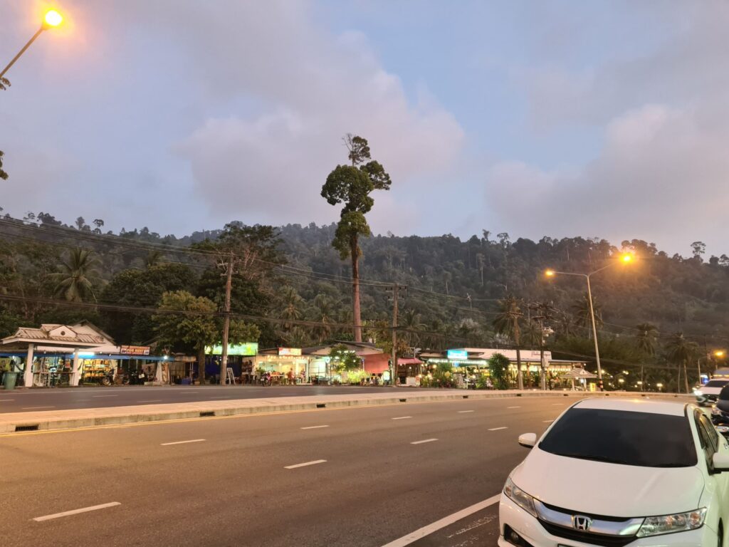 Le centre ville de Khao lak, dans la province Phang Nga, de là où je vais prendre le bateau demain, s’étire le long d’une route unique. On se croirait dans la jungle.