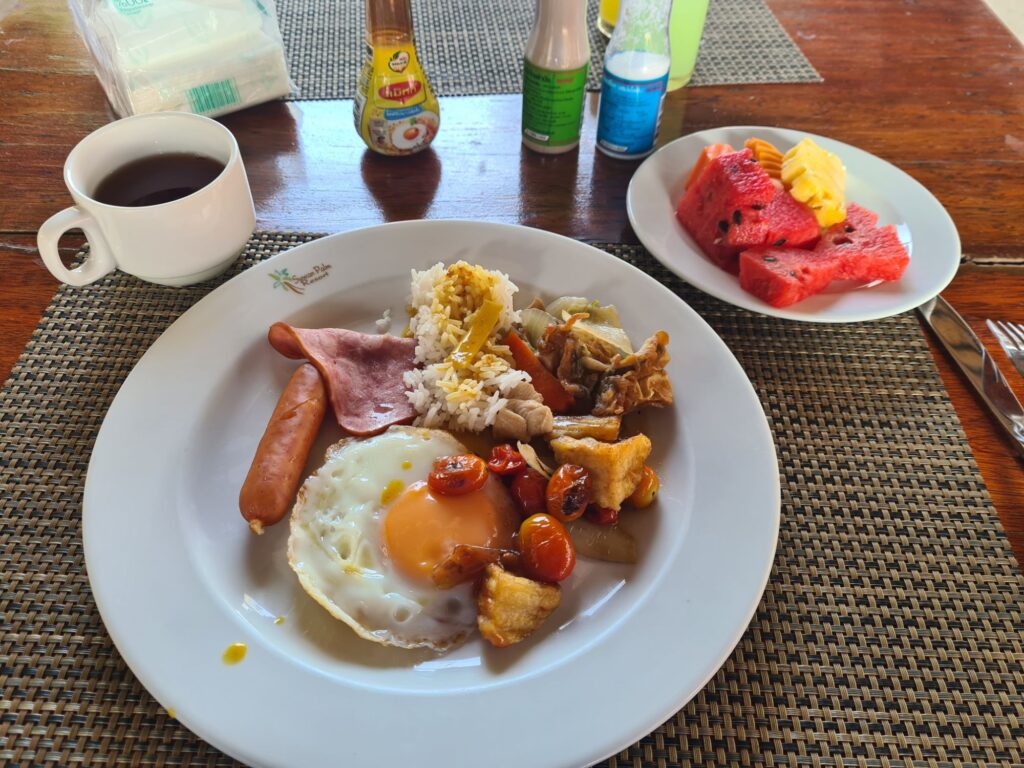 Petit déjeuner copieux (jus de fruit frais de chez frais !), riz au curry qui déchire, c’est épicé juste comme j’aime, à 9h00 du matin.