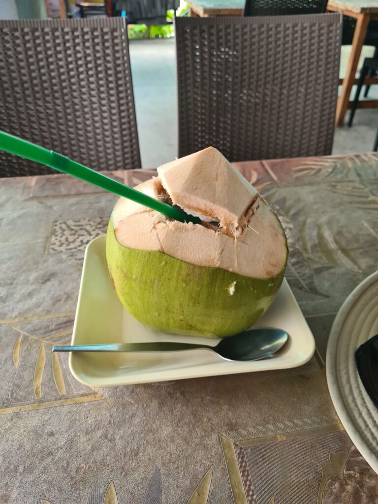 Un repas chez “Go pong”, conseillé par le centre : salade de la mer épicée après un jus de noix de coco (plus frais, tu meurs !)