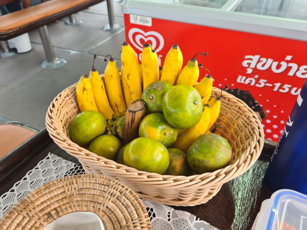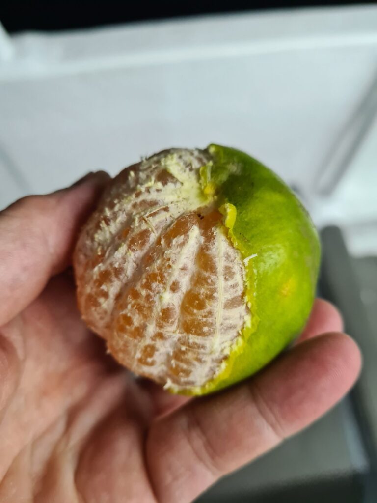 Plateau de fruits à disposition. Les mandarines locales (très douces) ont la peau verte !