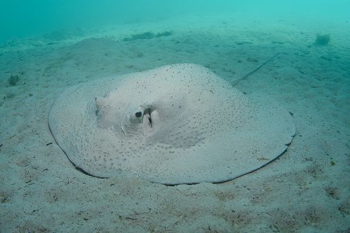 On passe encore quelques coraux et on voit une raie pastenague tranquille, le corps un peu ensablé et sous un promontoire corallien.