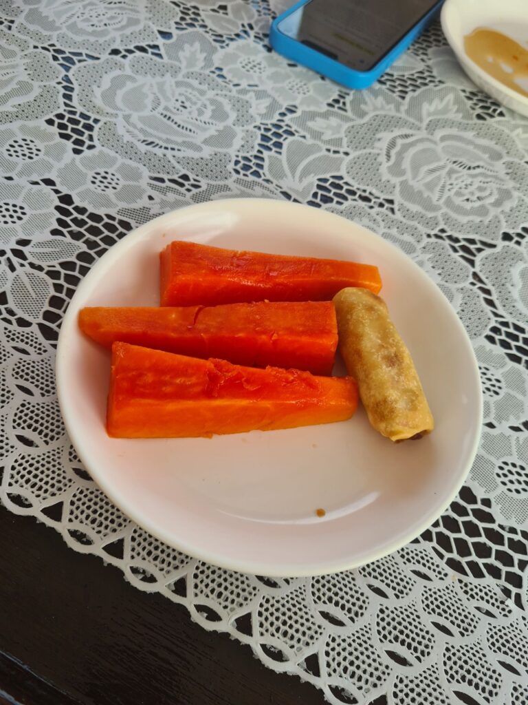 Au retour, je n’ai pas faim mais je ne résiste pas à la papaye fraîche. Aux nems non plus.