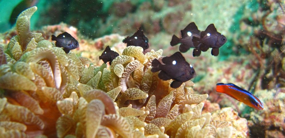 C’est tout noir, brillant et avec trois points blancs : le domino noir (nom savant Dascyllus Trimaculatus). Les juvéniles sont encore plus jolis que les adultes.