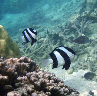 Des demoiselles à queue blanches (il y en avait aussi aux Maldives – voir Epave !) et autres poissons papillons.