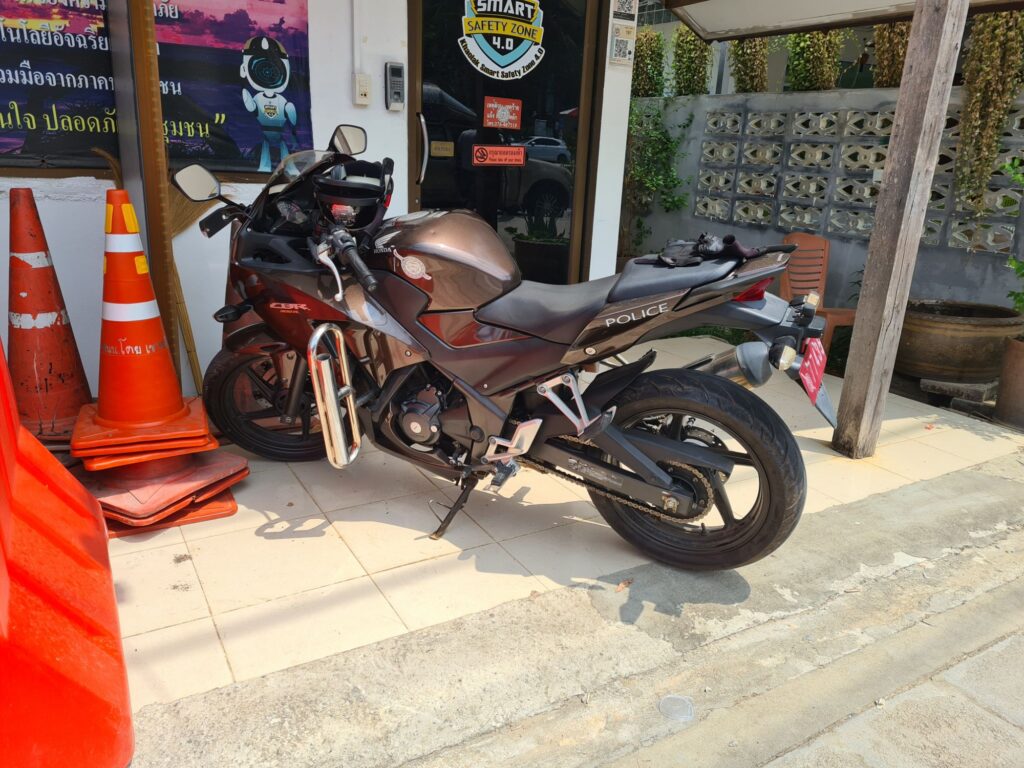 Les flics ont des motos. Honda 300 CBR. Quasiment d’origine si ce n’est les tubes en inox sur chaque côté. Utilité ? Je ne sais pas.