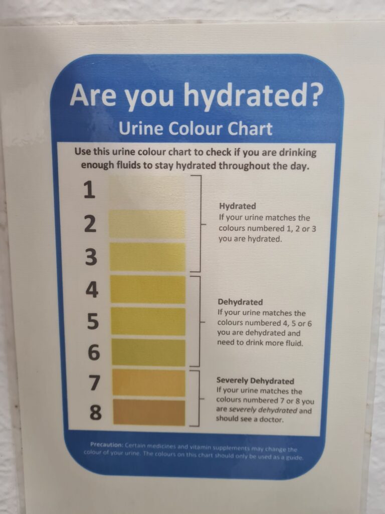 D’après le panneau dans les toilettes du bateau, ça va, j’étais toujours bien hydraté 🤪. Je bois rarement autant d’eau que je n’en ai bu ces derniers jours.