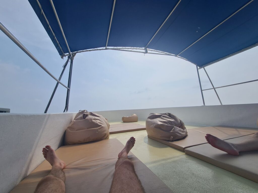 La zone supérieure du pont est la zone de détente. Je trouve qu’il y fait chaud le jour. Mais la nuit une partie de l’équipage y dort.