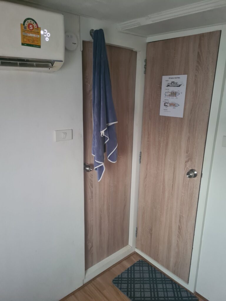 Ce n’est qu’au bout de 3 jours que j’ai réalisé qu’il y avait une porte dans ma cabine : douche et toilettes perso. Ça ne m’avait pas manqué, j’utilisais les communs.