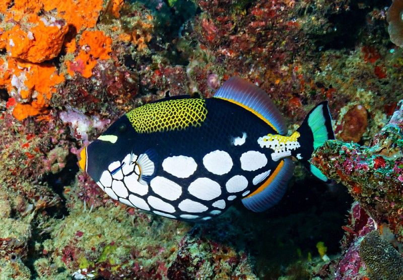 Je croise une baliste clown. Je crois me souvenir en avoir déjà vues mais je ne sais plus si c’était aux Maldives ou au Bahamas. C’est vraiment joli, on dirait un vrai dessin sur son flanc. C’est timide et solitaire, on n’en voit pas souvent.