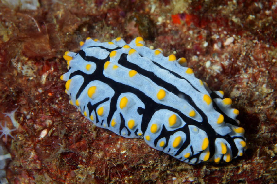 Bon, ça occupe cinq minutes. Je mets mon nez sur le corail et je trouve un nudibranche, très répandu, mais joli : phyllidia varicosa. Un cousin de celui vu précédemment (voir Le retour de l’ananas en colère)