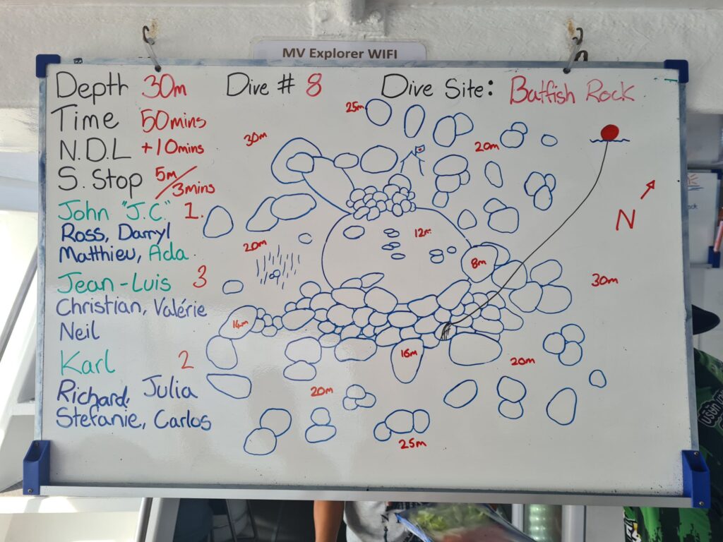 Le but est d’aller au nord voir le “jardin japonais”. Sans courant on devrait y arriver. C’est un endroit où les coraux semblent arrangés par une main humaine.