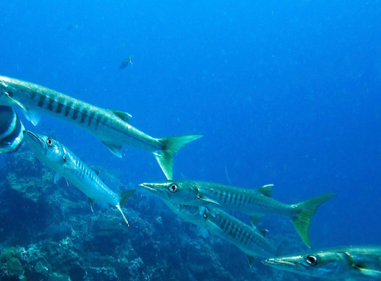 Et puis un barracuda. Puis cinq. Puis un ban entier. Ils sont petits, assez fins. Il tournent au dessus de nous, dans quinze mètres d’eau.