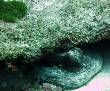 Il faut savoir que si on est au-dessus d’une pieuvre, elle craint la prédation. Le truc c’est d’être à sa hauteur pour tenter d’interagir. Après quelques minutes je remonte rejoindre les autres et je vois la pieuvre qui sort de son trou : l’alerte est passée, la voie est libre.