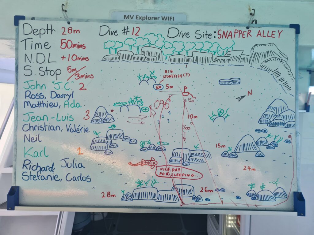 On passe la moitié du temps dans cinq mètres d’eau à fouiller le récif dévasté par la dynamite. Profil de plongée académique. Dix sur dix à l’examen avec un profil comme ça 😁