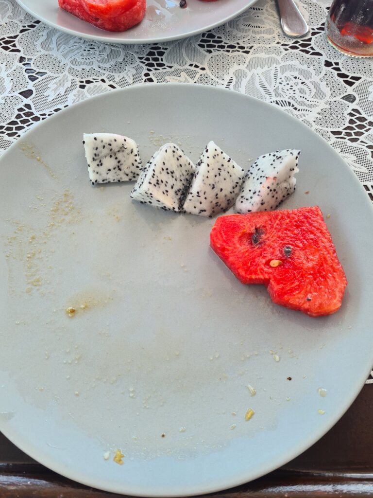 Des fois  au goûter nous avions des fruits inconnus. C’est très bon, les fruits inconnus.