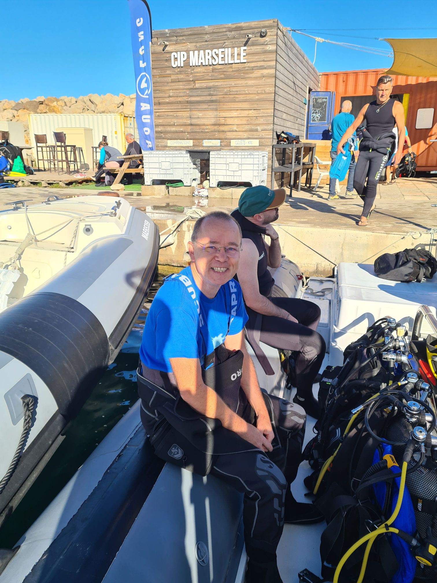 Sur le bateau, Nicolas est frigorifié, il mettra du temps à se réchauffer. Et moi je commence à avoir l’eau du tee-shirt qui ruisselle dans la combinaison. J’ai un peu froid alors je gonfle ma combinaison. Hop, au chaud.