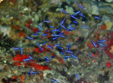 Philippe est à l’air, il aura plus de vingt minutes de palier. On les fait dans cinq mètres d’eau. Derrière un petit sec je trouve une foule de castagnoles juvéniles, bleus électriques.