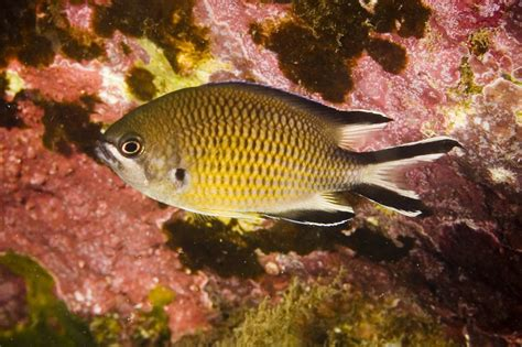 Rien de passionnant : on ne verra rien de bien spécifique. Les trompettes, les demoiselles bleues. J’arriverai à identifier quand mêmes des poissons qui ont un peu le forme des castagnoles, avec leur caudale fendue : les demoiselles de l’atlantique (Chromis limbata). Il y en a toujours un peu partout, en jaune ou blanc.