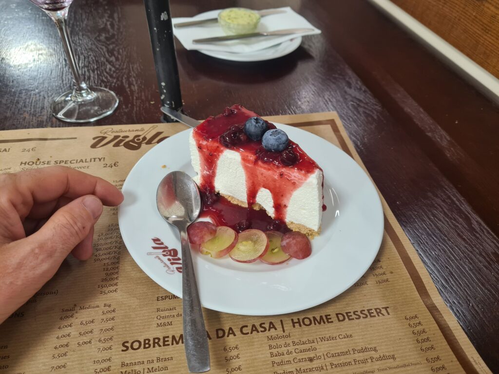 Chez Viola, au dessert un cheesckase aux fruits rouges. “Frutos vermelhos”, prononcez “Froutouch vermelouch” 😂 Ils sont fous ces portugais !