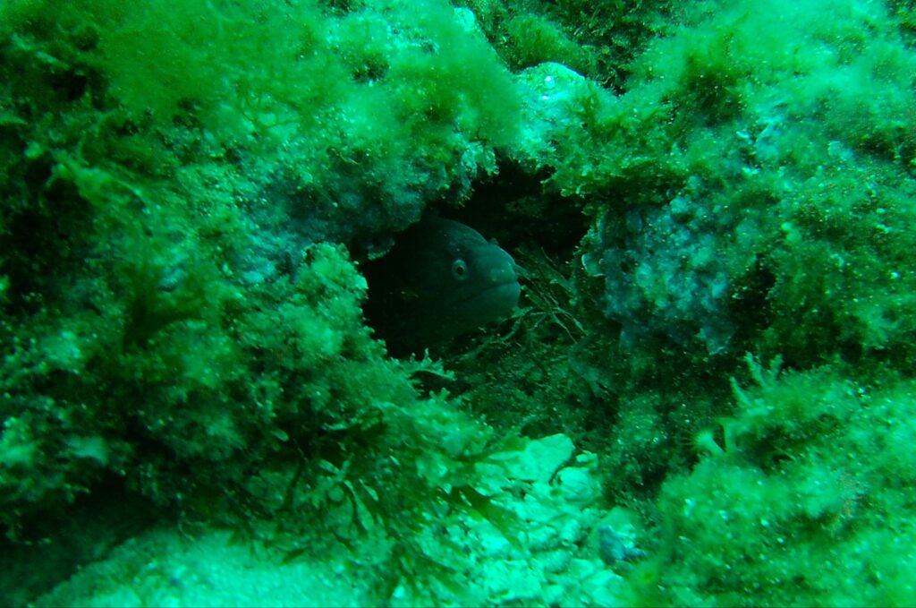 Nicolas est reparti, je plonge avec deux niveaux trois, qui ne se connaissent pas mais qui ont déjà plongé ensemble ce matin. David, et une jeune femme dont je ne connaîtrai pas le prénom. Comme ce matin, on se fait secouer jusqu’à la calanque de Pouars, zone privilégiée pour les baptêmes. Protégée, peu de fond. Sécurisant.