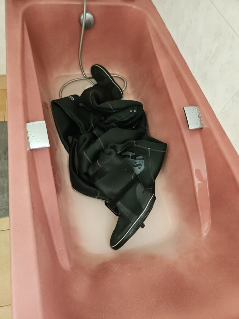 Évidemment je ne m’attendais pas à rincer l’intérieur de ma combinaison étanche si tôt ! Rinçage à l’eau douce bien entendu (à l’eau de mer c’est fait 😂) dans la baignoire (oui, elle est rose … ).