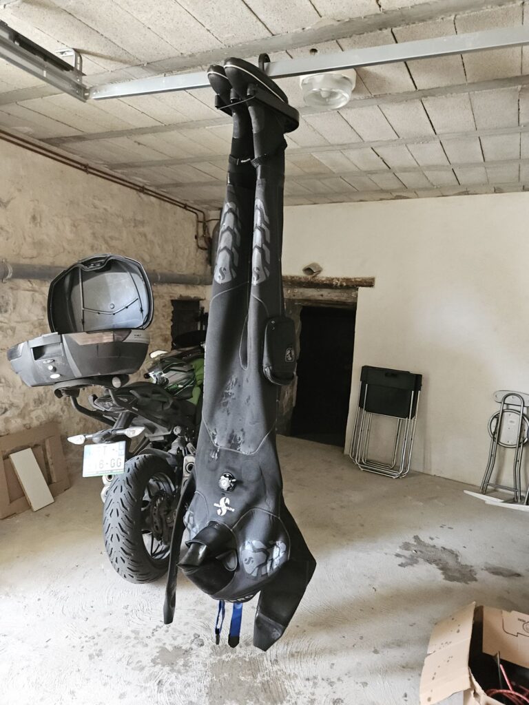 Séchage les pieds en l’air. Il faudra qu’elle soit sèche pour la prochaine plongée.