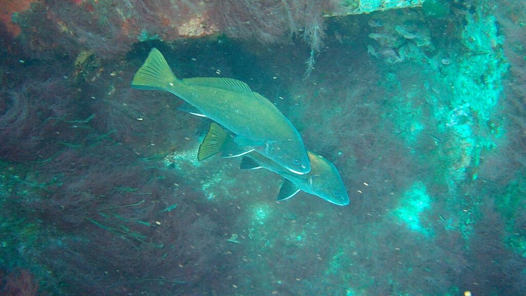 Je replonge avec Aurore et dès les premiers mètres c’est un beau mérou qui est en promenade puis un couple de corbs.