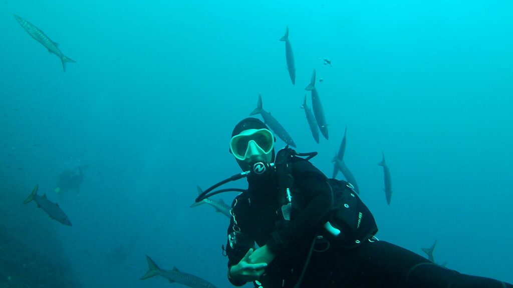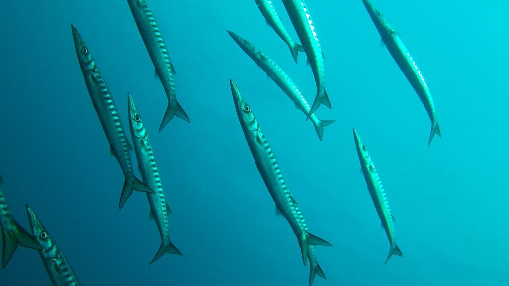 On croise une ban immense de barracudas. Ils sont des centaines.