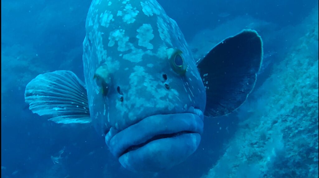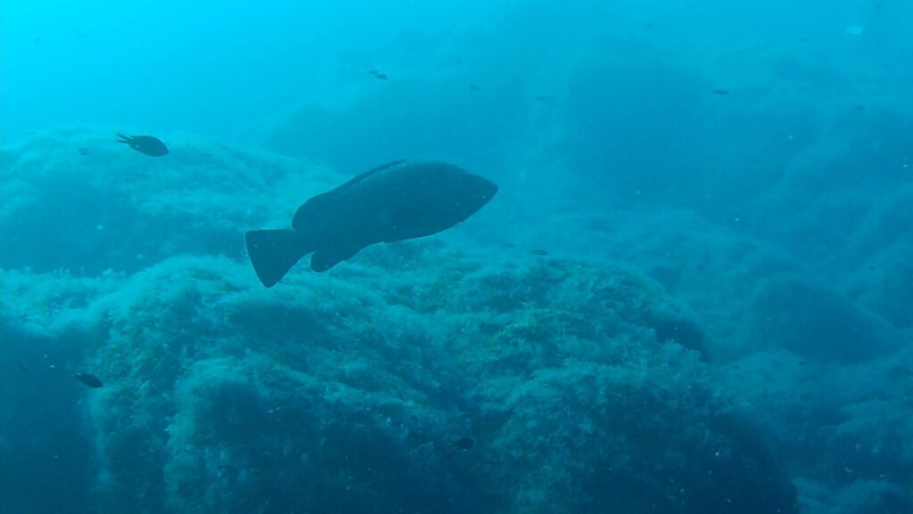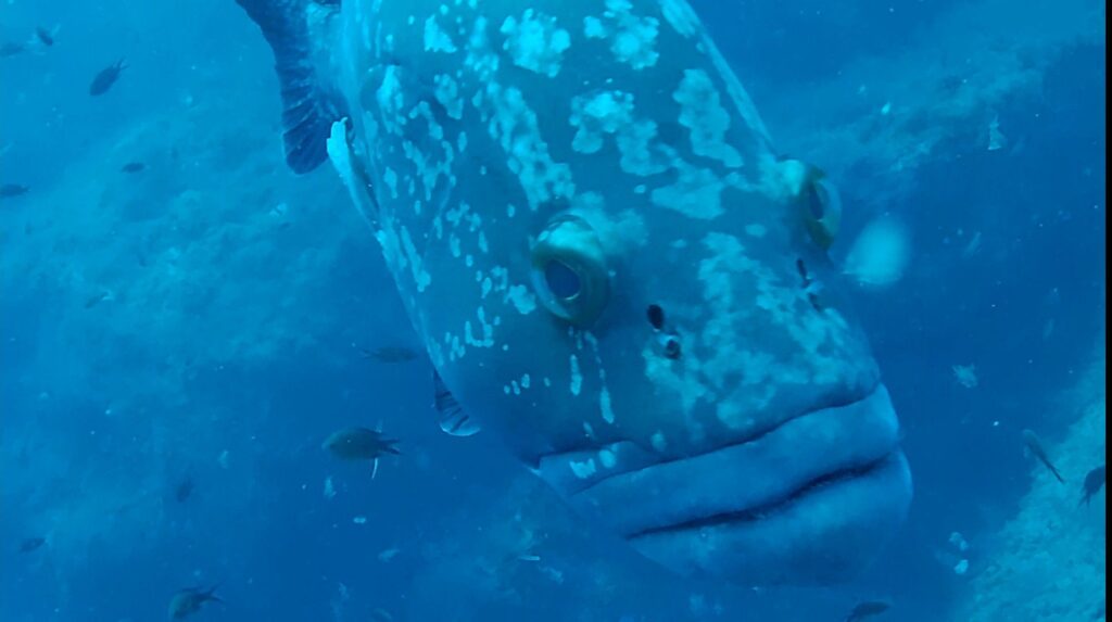 Et puis à un moment on trouve un mérou curieux. Il s’approchera de moi à être museau quasiment contre masque. L’animal n’est pas farouche, malgré le bruit de ma respiration et les bulles. Belle rencontre, ce n’est si souvent que j’ai la chance de voir un animal sauvage d’aussi près.